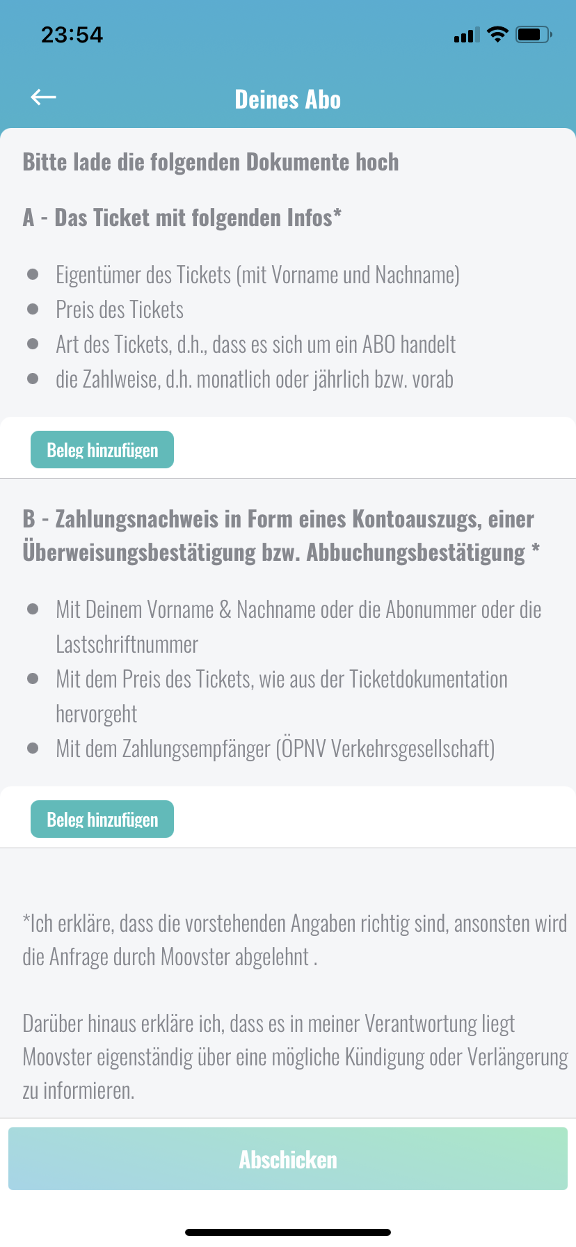 Dann habe einfach ein wenig Geduld bis Dein Abo in der Moovster App erscheint, denn jetzt für Dich im Hintergrund geprüft. Natürlich erhältst Du zum Ergebnis eine Rückmeldung.